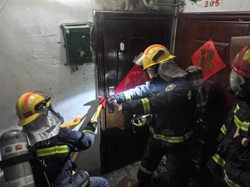 参与救援的特勤站助理指挥员吴硕说:“到达现场后,看到紧锁的门和不断冒出的黑烟,战友们各司其职,在3分钟后,防盗门被成功打开。”